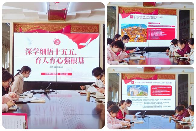 为深入贯彻落实上级党组织关于学习贯彻二十届四中全会精神的工作部署,深刻领会“十五五”时期发展的目标任务与根本要求,引导全体教职工将思想和行动统一到党中央的决策部署上来,公园路幼儿园支部于2025年11月25日开展了以“深学细悟十五五,育人育心强根基”11月主题党日活动。提升教职工的政治理论素养与立德树人的使命担当,为奠定社会主义现代化建设的人才根基贡献幼教力量。
